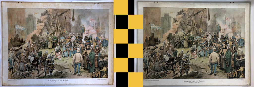 Hieronder kan je het voor en na beeld van de schoolplaat ‘Belegering van een kasteel, het huis Te Voorst 1362’ alvast bekijken.